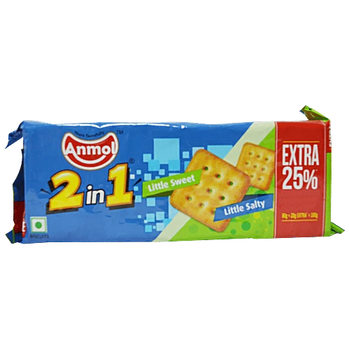 About the Product Magical Mix of sweet and salty in one biscuit. Enjoy the surprise in every bite. Our wide varieties of biscuits include Sweet, Semi-Sweet, Sandwiched and Health Biscuits. We are also manufacturing biscuits that are very popularly used as Snacks. At Anmol, we are also manufacturing Cup, Tiffin and Bar Cakes. Have you ever wondered what happens when two contrasting flavours come together? You get something that is scrumptiously sweet and salty with Anmol’s 2 in 1. Due to its distinctive flavours, this is a perfect tea-time companion for people of all age groups. Nutritional Facts Carbohydrates 73.0 g Sugars 17.4 g Proteins 8.0 g Total Fat 16.0 g Saturated fatty acids 8.1 g Monounsaturated fatty acids 6.4 g Poly unsaturated fatty acids 1.5 g Trans fatty acids 0 g Cholesterol 0 mg Energy 469 Kcal How to Use Enjoy the delicious flavour in every bite of these ready to eat biscuits. Storage Store in a cool, dry and hygienic place. Once opened, store in an airtight container.