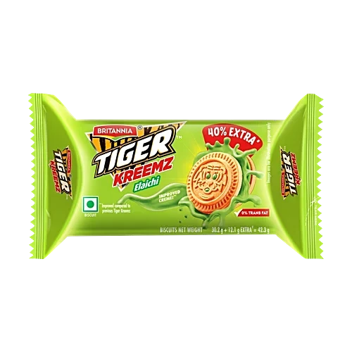 Britannia Tiger Elaichi Cream Biscuits are a twist to the tradition. The crispiness of biscuits when combined with the refreshing elaichi flavour, creates a delectable taste. Britannia biscuits and cookies for a long has been a part of every home, sharing those moments of joy. Believing in delivering fresh and healthy products, Britannia India manufactures some of India's favourite brands like 50-50, Tiger, NutriChoice, Bourbon, Good Day, Milk Bikis and Little Hearts. Ingredients Prepared Using Refined Wheat Flour (Maida), Sugar, Edible Vegetable Oil (Palm) And Interesiirified Vegetable Fat, Invert Syrup, Edible Starch, Raising Agents, Iodised Salt, Emulsifiers, Ferrous Salt, Dough Commoner (223) And Vitamin, Artificial Flavouring Substances (Cardamom & Vanilla) How to Use Crunchy biscuits filled with a creamy twist to fill every bite of these ready to eat biscuits with a delighting taste.