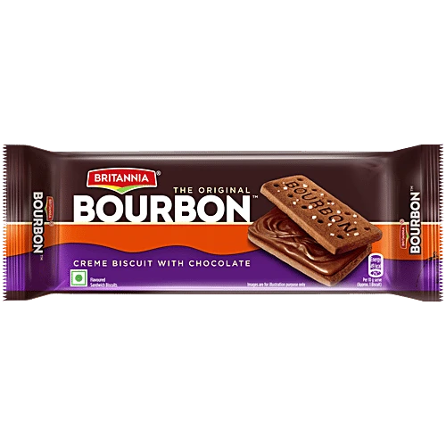 About the Product Britannia Bourbon - The Original Choco Creme sandwich biscuits are a delightful combination of smooth choco creme and crunchy choco biscuits topped with sparkling sugar crystals. Every bite of these delicious, chocolaty and indulgent cookies entices you to have more and more. Britannia Bourbon fuels every BFF's ever-growing hunger for fun and fulfilling moments. Made with love, since 1955. Ingredients Refined Wheat Flour, Edible Vegetable Oil, Sugar, Edible Starch, Cocoa Solids, Milk Solids, Raising Agents, Iodised Salt, Nature Identical Artificial Flavouring Substance- Vanilla Chocolate. How to Use Ready to eat biscuits. Store in a cool and dry place. Please transfer the contents to a clean airtight container once the pack is opened. Storage Store in a cool and dry place.