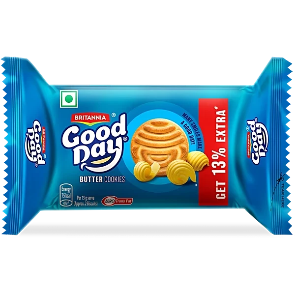 Britannia Good Day Butter Cookies are delicious butter cookies, perfect with a cup of tea or to satisfy those hunger pangs between meals. With a light crunchy bite, the cookie melts in your mouth leaving a delicious buttery taste. Britannia biscuits, cookies, cakes and rusk are a perfect companion for your tea. Believing in delivering wholesome and delicious products, Britannia India manufactures some of India's favourite brands like 50-50, Tiger, NutriChoice, Bourbon, Milk Bikis and Marie Gold. Ingredients Refined Wheat Flour (Maida), Sugar, Edible Vegetable Oil (Palm), Butter (2%), Invert Syrup, Milk Solids, Raising Agents 503(I), 500I)], Iodised Salt And Emulsifiers (322, 471, 472E]. Contains Added Flavours [Natural Nature Identical And Artificial(Butter, Vanilla & Milk) Flavouring Substances]. Nutritional Facts Nutritional Values Per 100 G Energy (Kcal) - 494 Protein (G) - 7 Fat (G) - 22 Carbohydrates (G) - 67 Sugar (G) - 22 Care Instruction Store it in a dry place. Keep away from the moist area.