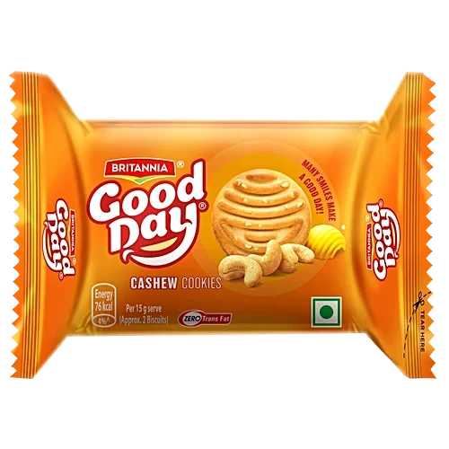 Britannia Good Day Cashew Almond Cookies are delicious crunchy cookies blended with a nutty flavour of cashews and almonds. 100% vegetarian, these cookies are your perfect snacking partner. Every bite of Britannia Good Day cookies is filled with goodness to make your day happy and good. Britannia biscuits, cookies, cakes, and rusks are a perfect companion for your tea. Believing in delivering fresh and healthy products, Britannia India manufactures some of India's favourite brands like 50-50, Tiger, NutriChoice, Bourbon, Milk Bikis and Marie Gold. Ingredients Refined Wheatflour (Maida) Refined Palm Oil, Sugar, Nuts [Almond (1.8%) & Cashew (0.4%)], Invert Sugar Syrup, Milk Solids (1.1%%), Raising Agents [503(Ii) & 500(Ii)]. Iodised Salt And Emulsifiers (322, 471 & 472E). Contains Added Flavours [Natural, Nature Identical And Artificial (Milk And Vanilla) Flavouring Substances. Nutritional Facts Nutritional Values Per 100 G Energy (Kcal) - 507 Protein (G) - 7.4 Fat (G) - 22.8 Carbohydrates (G) - 68 Sugar (G) - 21.4 How to Use Enjoy the delicious flavours in every bite of these Ready to eat cookies.