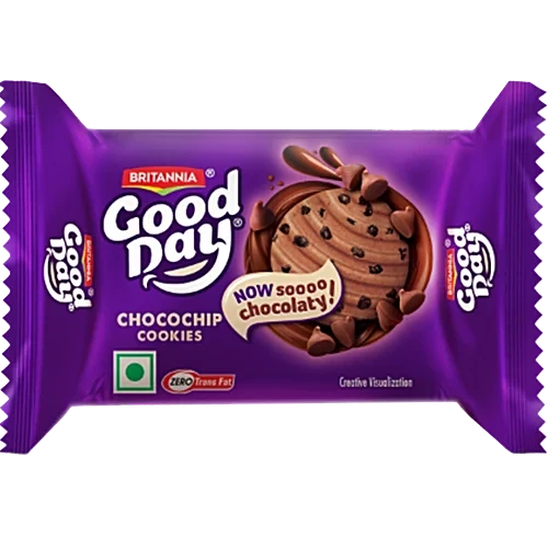 About the Product Britannia Good Day Chocochip Cookies are crunchy chocolate cookies loaded with melt-in-your-mouth chocolate chips. These cookies offer a delicious chocolate experience that is sure to satisfy any chocolate craving. Britannia biscuits, cookies, cakes and rusk are a perfect companion for your tea. Believing in delivering wholesome and delicious products, Britannia India manufactures some of India's favourite brands like 50-50, Tiger, NutriChoice, Bourbon, Milk Bikis and Marie Gold. Filled with chocolate chips that burst out of the surface, the Good Day Choco-chip cookie promises to satisfy the chocoholic in you. The flavoursome Choco chips are blended into the crunchy cookie in a manner that is sure to give you a mouthful of chocolate with every bite you take. Ingredients Refined Wheat Flour (Maida), Sugar, Edible Vegetable Oil (Palm), Chocolate Chips (11%) [Sugar, Cocoa Solids, Cocoa Butter, Dextrose, Emulsifier (322) And Added Natural Flavouring Substance (Vanilla)], Chocochips (10%)[Sugar, Edible Hyorogenated Vegetable Oil, Cocoa Solids, Dextrose, Emulsifier (322) And Added Natural Flavouring Substance (Vanilla)], Invert Syrup, Raising Agents [503(I), 50O(I), 450(|)], Cocoa Solids, 10Dised Salt And Emulsifiers (322, 472E). Contains Permitted Natural Food Colour (150) And Added Flavours (Artificial Flavouring Substances (Chocolate& Vanilla) Nutritional Facts Nutritional Values Per 100 G Energy (Kcal) - 493 Protein (G) - 5 Fat (G) - 21 Carbohydrates (G) - 71 Sugar (G) - 30 Care Instruction Store it in a dry place. Keep away from the moist area.