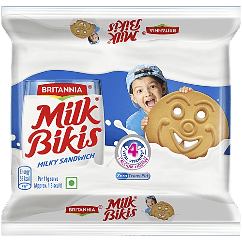 About the Product Britannia Milk Bikis Milk Cream Biscuits are crunchy biscuit sandwich filled with a milky cream. The biscuits are prepared with essential nutrients, iron, vital vitamins and iodine making them a healthy snack for your children. Every delicious bite of Milk Bikis helps in the mental and physical development of growing kids. Britannia biscuits and cookies for long has been a part of every home, sharing those moments of joy. Believing in delivering fresh and healthy products, Britannia India manufactures some of India's favourite brands like 50-50, Tiger, NutriChoice, Bourbon, Good Day, Marie Gold and Little Hearts. Ingredients Prepared Using Refined Wheat Flour (Maida), Sugar, Refined Oil, Invert Sugar Syrup, Raising Agents, Milk Solids, Iodised Salt, Vitamins, Calcium Salt, Nature And Artificial Favour- Milk How to Use Enjoy the delicious flavours in every bite of these ready to eat biscuits. Storage Store in a cool and dry place.