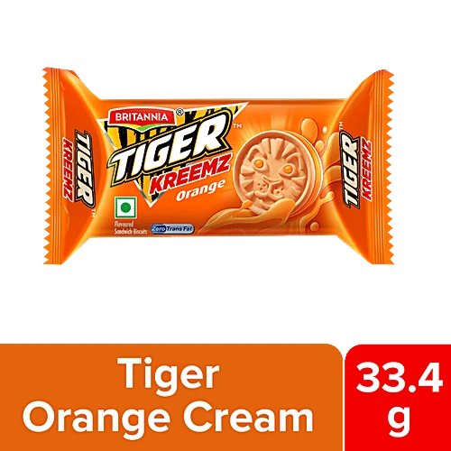 About the Product Britannia Tiger Orange Cream Biscuits are filled with the tangy flavour of orange. These cream biscuits with its refreshing taste are a delicious companion for your kid milk time. Britannia biscuits and cookies for long has been a part of every home, sharing those moments of joy. Believing in delivering fresh and healthy products, Britannia India manufactures some of India's favourite brands like 50-50, Tiger, NutriChoice, Bourbon, Good Day, Milk Bikis and Little Hearts. Ingredients Prepared Using Refined Wheat Flour (Maida), Sugar, Edible Vegetable Oil (Palm] & Interesterified Vegetable Fat, Invert Syrup, Edible Starch, Dextrose, Raising Agents, Milk Solids, Iodised Salt, Emulsifiers, Acidity Regulator, Ferrous Salt, Dough Conditioner And Vitamin, Artificial Flavouring Substances-Orange Storage Store in a cool and dry place. How to Use The tangy taste of orange wrapped between crunchy biscuits to fill every bite of these ready to use biscuits with a refreshing taste.
