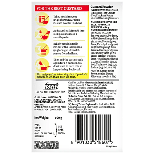 Ingredients Maize Starch, Salt. Contains Permitted Synthetic Food Colours-102, 110, 124 And Added Flavours-Artificial And Nature Identical Vanilla Flavouring Substances Nutritional Facts Nutritional Values per 100 g Energy (Kcal) - 353 Protein (g) - 0.4 Fat (g) - 0.1 Carbohydrates (g) - 85 Sugar(g) - Nil How to Use Take 2 tablespoons (25 g) of Brown & Polson Custard Powder in a bowl. Add 125 ml milk from 1/2 litre milk pouch to make a smooth paste Boil the remaining milk (375 ml) with 4 tablespoons (50 g) of sugar. Mix well & remove from the flame. Then add the paste & cook again for 24 minutes. You don't
