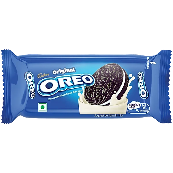 Oreo: milk's best friend for over 100 years! Cadbury Oreo Chocolate crème sandwich biscuit consists of two chocolatey biscuits with a rich chocolate crème filling between them. Cadbury Oreo crème biscuits are made with cocoa, which defines their unique chocolatey flavour. Add this crunchy delight to your snacks and gift yourself rich and smooth joy. Oreo biscuits are perfect for snacking or enjoying as a treat at any time of the day. Twist, lick and dunk! Enjoy Oreo sandwich cookies with a glass of milk or add them to your favourite recipes such as cakes and milkshakes! Add a scoop of vanilla ice cream to Oreo biscuits to make your own creamy dessert! Available in single & family/combo packs. This biscuit pack is suitable for vegetarians. Ingredients Refined Wheat Flour (Maida), Sugar, Fractionated Fat, Palmolein Oil, Cocoa Solids (3%), Invert Sugar, Leavening Agents (500(ii),503(ii)), Starch, Iodised Salt, Emulsifier (322). Natural Identical Flavouring Substances. Nutritional Facts Per 100 g Energy (kcal) - 483 Protein (g) - 5.3 Added Sugars (g) - 37.9 Carbohydrates (g) - 71.4 Total Fat (g) - 19.7 Total Sugars (g) - 38 Saturated Fat(g) - 9.8 Cholesterol (mg) - 0 How to Use Twist, lick and dunk!