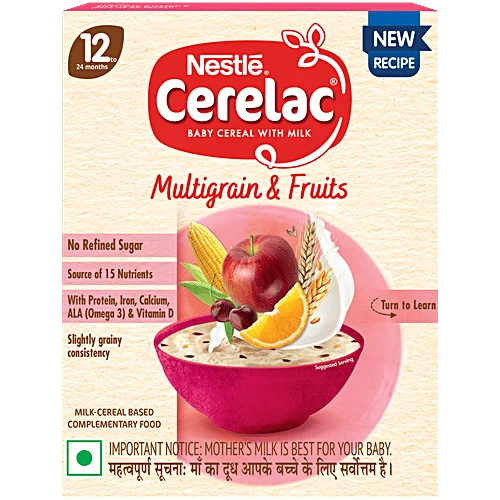 Nestle Cerelac Baby Cereal with Milk is a complementary baby food for infants from 12 to 24 months. While infants and children have higher requirements of nutrients than adults, 2 serves of Cerelac Multigrain Dal Veg Cereal provide 37% of a baby's daily need of iron.