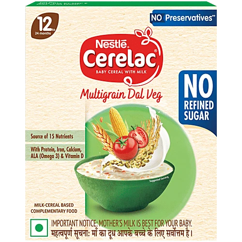 Nestle Cerelac Baby Cereal with Milk is a complementary baby food for infants from 12 to 24 months. While infants and children have higher requirements of nutrients than adults, 2 serves of Cerelac Multigrain Dal Veg Cereal provide 37% of a baby's daily need of iron.