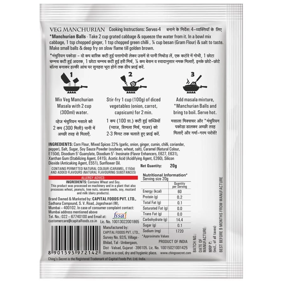 Easy-to-cook Masala Now make India’s favourite Desi Chinese dishes for your family at home! Cook up a different Desi Chinese dish every day with our Chinese Masala pouch. Now make Restaurant Style Manchurian with ease at home, because ' Ching's Secret Manchurian Masala hai nah'. It is so perfectly blended that you don’t even need to add any salt, spice or sauces additionally. Cook up your favourite Veg/ Gobi Manchurian with total ease in a few simple steps. Ab jab bhi kare dil, Ching’s Desi Chinese nahin mushkil! Nutritional Facts Amount Per Serving: 60g Calories from Fat 81 Calories 260 Total Fat 9g Saturated Fat 5g Trans Fat 0g Cholesterol 0mg Sodium 915mg Total Carbohydrates 38g Dietary Fiber 3g Sugars 0g Protein 6g Features Easy-to-cook Desi Chinese meal kits No need to add salt, spice or sauce Contains the exact balance of spice mi