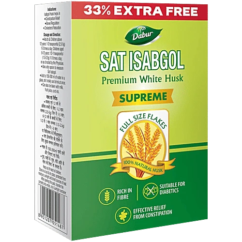 Dabur Sat Isabgol From the Brand Dabur Sat Isabgol is an instant mix natural fibre of Plantogo ovata. Isabgol is derived from the upper coating of the seeds by milling and sieving process. Composition Psyllium husk Features Isabgol (aka Psyllium) naturally helps:• relieve constipation• remedy diarrhea• improve digestion• cleanse colon• remedy fissures• helps reduce cholesterol How to Use For adults and children above 12 years of age: 1-2 teaspoon (2.5-5g) 1 to 3 times a day.For children from 6 - 12 years of age: 1/2 -1 teaspoon (1-5 - 2.5g) 1 to 3 times a day OR as directed by the physician. Add 100-200 of water in a glass, stir briskly and drink at once.