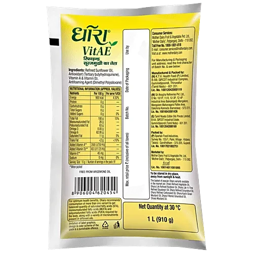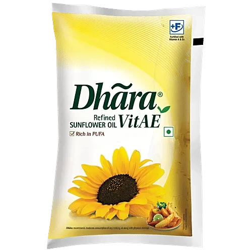 Dhara Health Refined Sunflower Oil comes with the goodness of unique Low Absorb Technology, which means that the food cooked in it absorbs less oil. It also contains the goodness of Vitamins A, D, and E. Dhara Health is a good source of polyunsaturated fatty acids (PUFAs) and contains a high amount of Omega 6, the Essential Fatty Acid (EFA), which cannot be synthesized in the body and has to be consumed from external sources.