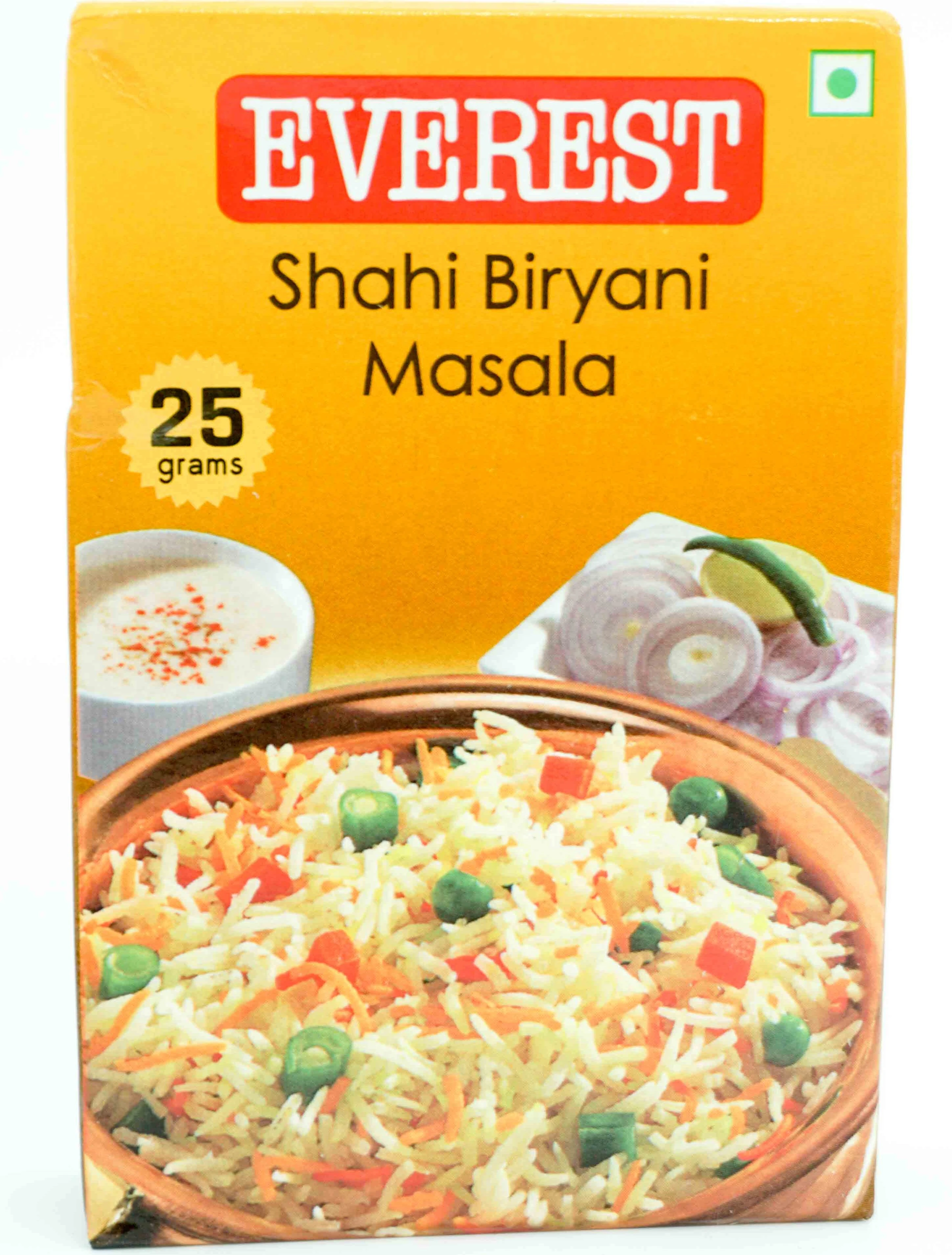 Everest presents their authentic range of masalas that are blended with a wide variety of handpicked and selected spices that bring a whole new flavour and meaning to your dishes. Rake up your favourite recipes and cuisines by adding this magical blend of Everest masalas. Ingredients Everest Shahi Biryani Masala is made from 15 different kinds of perfectly roasted and grounded masala. These include black pepper, chilli, cumin, cassia, cardamom, caraway, mace, nutmeg, dry fenugreek leaves, clove, turmeric and coriander which add lots of flavour and texture to regular rice. Benefits The spices that go into making the Shahi Biryani Masala are storehouses of medicinal properties. For instance, cardamom is efficient in combating acidity, nausea and helps in digestion process. Nutmeg helps in detoxifying the body and is beneficial in curing insomnia. Furthermore, it adds a blast of flavour to your favourite Biryani along with a perfect aroma!