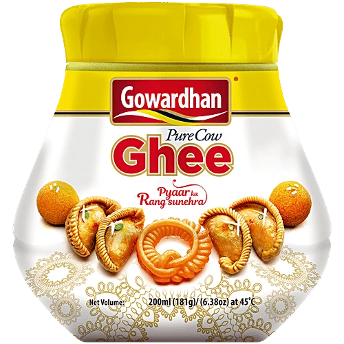 Ghee is a class of clarified butter that originated in ancient India. It is commonly used in Indian cooking. Gowardhan Pure Cow Ghee can be swapped for vegetable oil or coconut oil in baked goods or can be used for deep-frying. Simply melt it and spread it on roti, or pour it on vegetables/dal before serving. So go ahead and buy this product online today! Features & Details Can be consumed directly or can be swapped for oil/butter