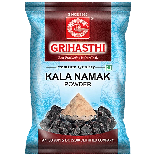 A common item you will find in any Indian kitchen, Black Salt has various health benefits and digestive aid properties. One of the great qualities is being low in sodium and high in other vital nutrients, Grihasthi Black Salt Powder is a special one that will help in reducing bloating and also prevent upsetting the stomach. Heated and traditionally prepared, it has all the goodness of salt rock. Inculcate it in your daily life in any form and power up your meals and your health instantly. A top product from the Grihasthi since 1975 that contains no added preservatives and chemicals at all. Ingredients Whole Black Salt. How to Use Best suitable in chaat, raitas and chutneys. Enhance your Indian homemade snacks with a sprinkle of black salt for a quick savoury salty punch. Storage Instruction: