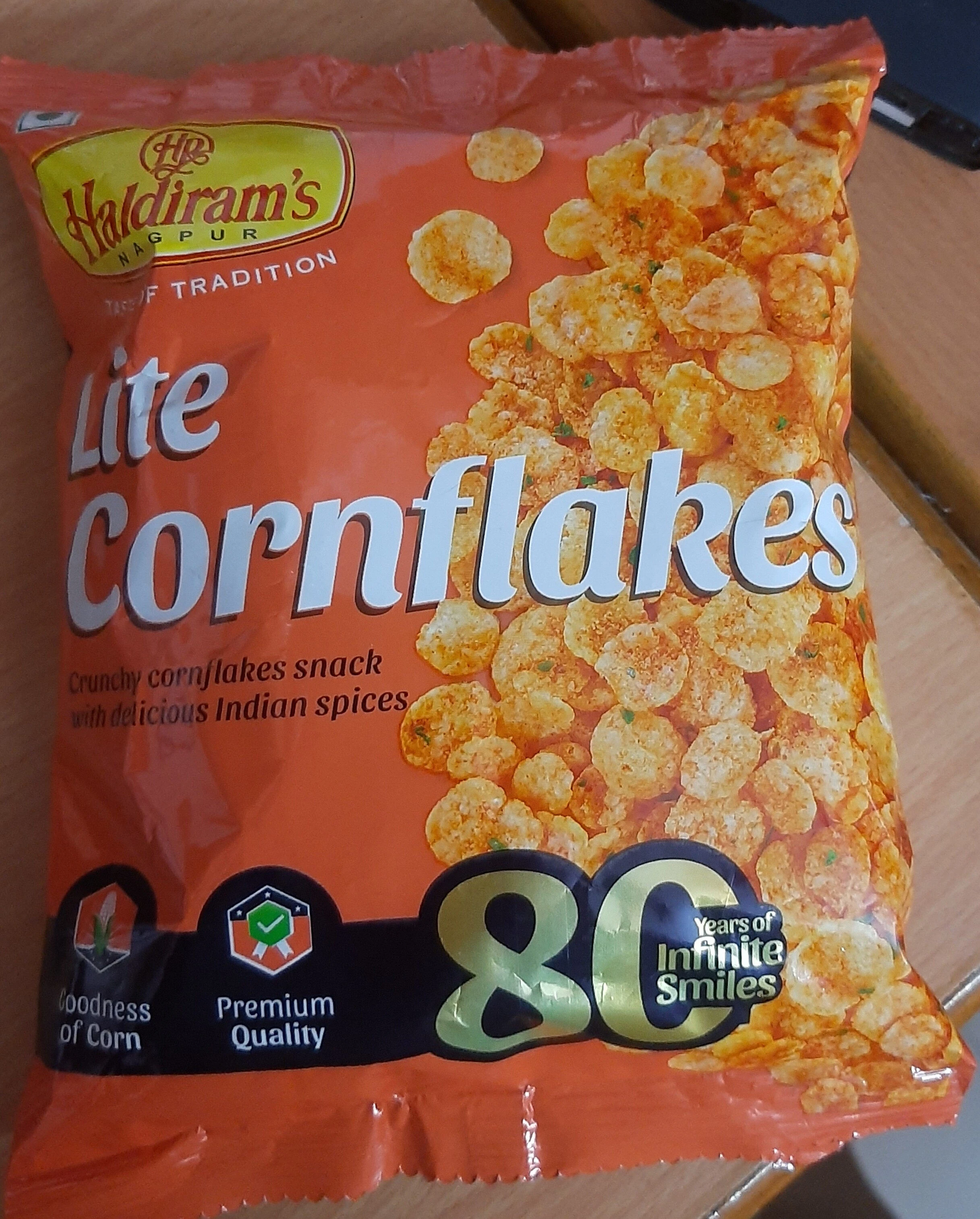 About the Product Haldirams brings to you the authentic Corn Flakes Mixture. This namkeen is a sweet and spicy snack. It is prepared from crunchy cornflakes, fried peanuts, cashews, raisins that gives you a delicious and aromatic mix. It has all essential vitamins and minerals that your body is needs. This mixture is so crunchy, tasty and colourful. Its so tasty that you can't stop eating it all day long. It makes a good tea time snacks, when you want to munch something. This mix is light and easy to digest. Ingredients Cornflakes (Derived from Corn) (26%), Edible Vegetable Oil, Potatoes (8%), Gram Pulse Flour (8%), Cashew Nuts (7%), Raisins (7%), Sugar Powder (6%), Edible Common Salt Powder, Spinach Powder, Edible Starch, Sesame Seeds, Mango Powder, Black Pepper Powder, Clove Powder, Mace Powder, Nutmeg Powder, Turmeric Powder, Cinnamon Powder, Black Salt Powder, Cardamom Powder, Ginger Powder, Cumin Powder, Fennel, Asafoetida Powder, Acidity Regulator (INS 330) and Anticaking Agent (INS 551). CONTAINS PERMITTED NATURAL COLOUR (INS 140). Benefits 1. A perfect blend of tasty and delicious flavours. 2. It is made with fine ingredients. 3. It is crunchy, tasty and colourful. 4. It is healthy and contains essential vitamins and minerals necessary for your body. Nutritional Facts Energy 525kcal,Protein 10g, Carbohydrate 56g, Sugar 16g, Fat 29 g Sodium 690mg.
