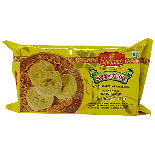 About the Product Haldirams Soan Cake Is a traditional Indian Flaky Sweet Cake With Almonds & Pistachios. Soan Papdi was re-invented as a soft, luxurious cake infused with a flavourful blast of cardamom and dry fruits. With every bite so rich and delicious, Soan Cake is an all-time favourite dessert from Haldiram's. Ingredients Refined Sugar, Refined Palmolein Oil, Besan or Bengal Gram Flour, Maida, Liquid Glucose, Almond, Cardamom & Pistachio Nutritional Facts Nutritional Values Per 100G : Energy: 504 Kcal Carbohydrate: 66.54G Sugar: 46.22G Total Fat: 23.10G Saturated Fatty Acids: 8.53G Monounsaturated Fatty Acids: 9.35G Polyunsaturated Fatty Acids: 2.23G Trans Fatty Acids : 0G Protein: 7.46G Fiber: 0.39G Cholesterol: Nil * These Are Approximate Values. Storage Store in a cool, dry and hygienic place.