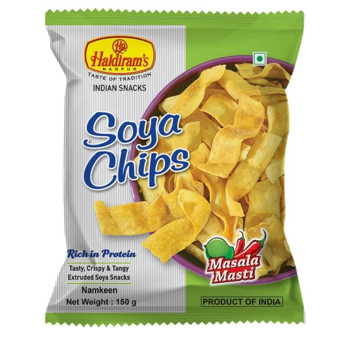 Product Haldiram Soya Chips are wholesome crispies. It is made with soya flour blended with some spices. These tasty and crispy Indian snacks is also known as the time pass snack. It is healthy and nutritious snack which is high in protein. It is a great snack option for your child's tiffin box. They are tasty, crunchy and spicy snack. Savour these at any time of the day. Enjoy it with tea, coffee or as a evening snack or as a snack to much on while travelling. Ingredients Tapioca Starch. Refined palmolein Oil, Soya Flour(8%), spot Pulse Urd (Urd Dal) Flour, Refined sugar, Iodised Salt, Hydrogenated Vegetable Oil (Vanaspati), Red Chilli Powder, Coriander Powder, Currun Powder, Clove Powder, Dried Mango Powder, Black Pepper, C... lamom, Acidity Regulator (INS 330), Onion Powder, Garlic Powder, Black Salt, Asafoetida, Bay Leaf, Nutmeg, Cinnamon, Fennel Seed, Turmeric & Mustard Seed. Benefits 1. It is a healthy snack option for you and your kids. 2. It is made with all natural ingredients. 3. It is high in protein and is nutrition's. 4. They are crispy, crunchy and spicy. Nutritional Facts Energy 554 kcal, Carbohydrate 45.0 g Sugar 4.21 g, Total Fat38.21 g Saturated Fatty Acids 18.56 g Monounsaturated Fatty Acids 11.28 g Polyunsaturated Fatty Acids 3.46 g Trans Fatty Acids 0 g, Protein 7.46 g, Fibre 0.88 g, Sodium 629 mg, Cholesterol 0 mg .