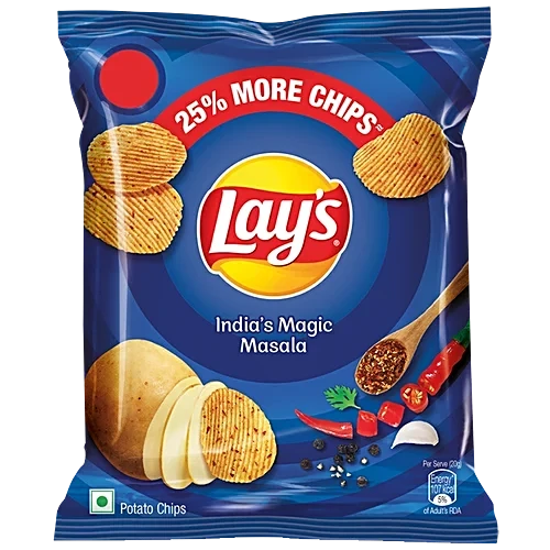 About the Product Taste the unbeatable blend of delectable Indian spices with the best quality potatoes. Delicious individual bags: perfect for snacking at work, home or school. About the brand: Lays, the worlds largest and favourite snack food brand, has steadily established itself as an indispensable part of Indian snacking culture since its launch in 1995. With its irresistible taste, international and Indian flavours, Lays has established itself as a youth brand and continues to grow in the hearts and minds of its consumers. Lays is made with Indias best-quality fresh potatoes, simply sliced and cooked in edible vegetable oils, and then seasoned with delicious flavours! Ingredients Potato, Edible Vegetable Oil, **Spices & Condiments (Onion Powder, Chili Powder, Dry Mango Powder, Coriander Powder, Ginger Powder, Garlic Powder, Black Pepper Powder, Turmeric Powder, Cumin), Salt, Black Salt, Sugar, Tomato Powder, Citric Acid, Tartaric Acid. Storage Store in a cool, dry and hygienic place. Keep away from direct sunlight. Once opened, keep in airtight container.
