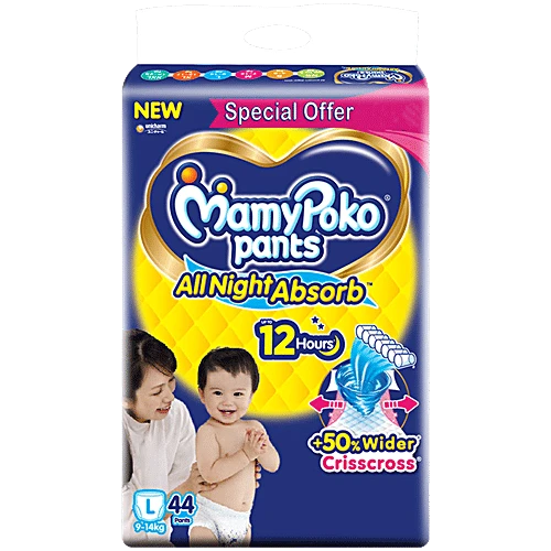 Experience superior comfort and worry-free days with Mamy Poko Pants Standard Diapers. The innovative Widespread Crisscross Sheet design boasts 50% more absorption area on the sides, ensuring rapid and consistent urine absorption for up to 10 hours.