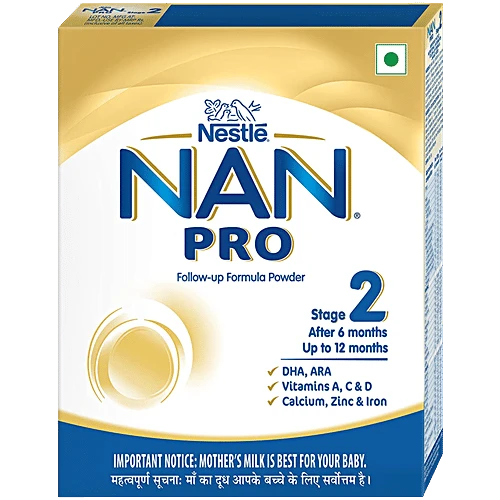 Nestle Nan Pro 2 is a spray-dried follow-up formula with DHA, ARA, Vitamins A, C, D, calcium, zinc, and iron for infants aged 6 to 12 months when they are not breastfed. Nestle Nan Pro 2 contains DHA, which helps support normal brain development. It also contains iron, which helps support normal cognitive development, as well as vitamins A, C, and zinc, which contribute to normal immune system function. Additionally, it contains calcium and vitamin D, which help support the normal growth and development of bones. With 155 years of expertise in infant nutrition, Nestle develops infant nutrition products backed by evolving science and research. Innovation has been at the heart of Nestle since its beginning. Nestle agrees with the World Health Organization and other medical and health associations that breast milk is the best and most natural food for babies. Important Notice: Mother's milk is best for your baby.