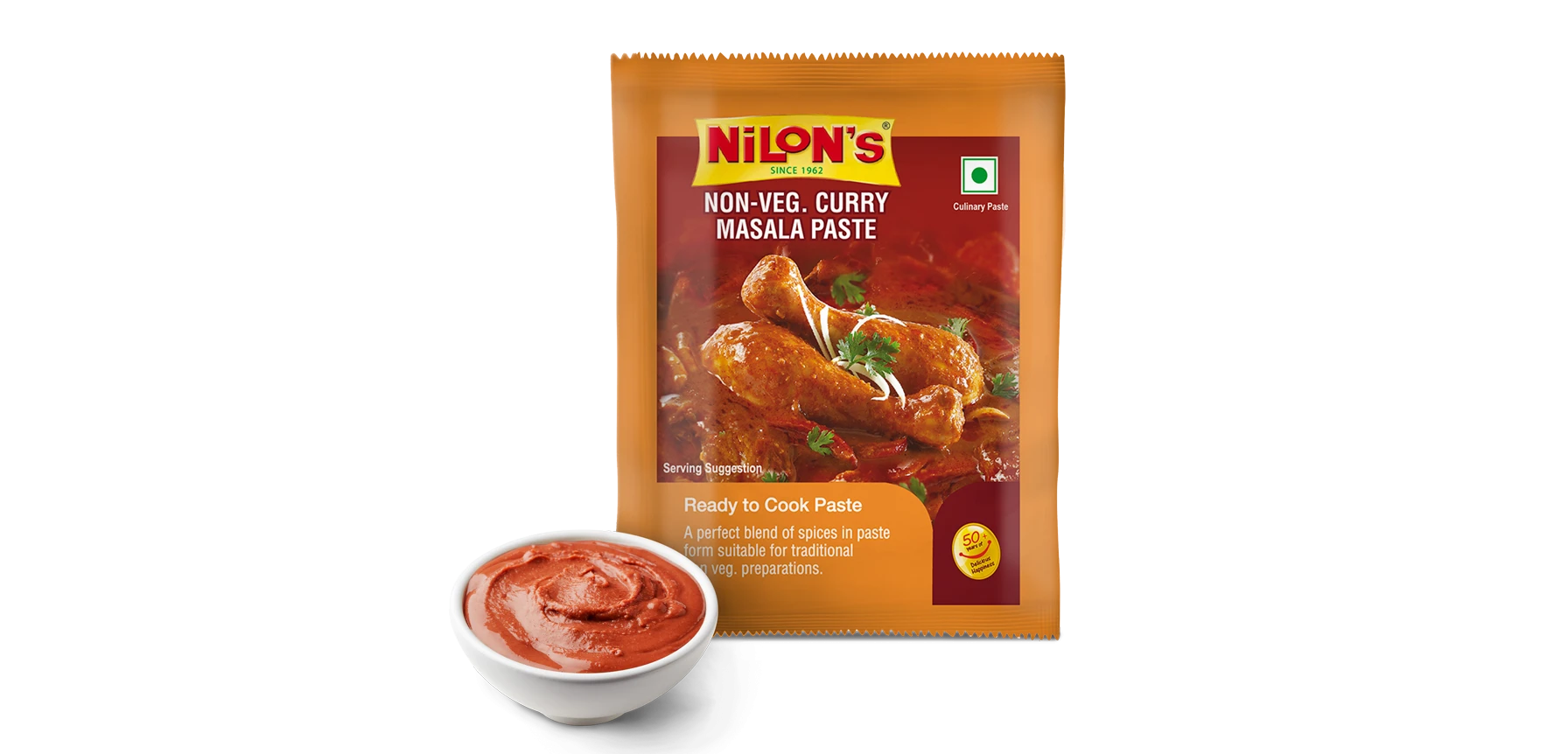 Consisting of Cardamom Powder, Cinnamon Powder, Clove Powder, and many more ingredients – Nilon’s Non-Veg Curry Masala will make your Chicken and Mutton dishes truly lip-smacking. Available in 10rs Ingredients Edible Veg Oil (22%), Onion (20%), Garlic (18%), Ginger (11%), Tamarind (8%), Iodised Salt (7%), Coriander powder (3%), Cardamom powder, Cinnamon powder, Cloves powder, Chilli Powder, Cumin powder, Turmeric powder, Preservative (E-211), Acidity Regulators (E260) Nutritional Information Energy 225 Kcal, Protein 3.6g, Total Carbohydrates 12.2g, Total Fat 18.4g, Saturated Fat 4.3g, Monounsaturated Fat 7.4g, Polyunsaturated Fat 5.7g, Trans Fat 0g, Cholesterol 0g