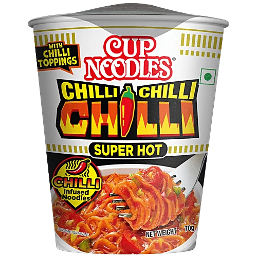 About the Product Thrice the explosion of spiciness, now just in 3 minutes. A 180-second wait to a 180-degree turnaround. Try the Cup Noodles Chilli Chilli Chilli, at the earliest, A delicious Chinese masala already added to the noodles for quick preparation Explore more Nissin Noodles ranges only in Big basket! Ingredients Refined Wheat Flour (Maida), Edible Vegetable Oil (Palm Oil & Coconut Oil), Iodised Salt, Sugar, Dehydrated Vegetables - 3.59% (Red Chilli Flakes, Cabbage, Red Chilli Rings & Green Capsicum), Mixed Spices - 2.68% (Red Chilli & Cumin), Hydrolyzed Vegetable Protein (Soya), Noodle Powder [Refined Wheat Flour (Maida), Edible Vegetable Oil (Palm Oil), Iodised Salt, Sugar, Acidity Regulators (Ins 500(I), Ins 451(I) & Ins 330), Flavour Enhancers (Ins 627 & Ins 631) & Antioxidant (Ins 319)]. Yeast Extract Powder, Milk Solids, Garlic Powder, Onion Powder, Acidity Regulators [Ins 330, Ins 500(I) & Ins 451(I)], Red Chilli Extract, Thickeners (Ins 415 & Ins 412), Flavour Enhancers (Ins 627 & Ins 631), Nature Identical Flavour, Anticaking Agent (Ins 551) & Antioxidant (Ins 319). How to Use 1. Pull back the lid halfway and fill the cup with hot water up to the inside line. 2. Close the lid and wait for 3 minutes. 3. Remove the lid. Stir well to mix the ingredients & enjoy your Cup Noodles. Nutritional Facts Per 100 g: Energy - 444.49 Kcal Protein - 10.20 g