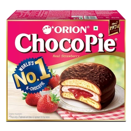 Orion Strawberry Choco Pie - Centre filled with Strawberry Jam in Choco Pie It's made with real Strawberries & has a strawberry content of 39% These delicious choco pies can be consumed as a snack at any time of the day - an afternoon munchies, evening snack or late-night treat for adults and kids.