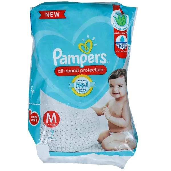 Pampers baby-dry pants style diapers are the only pants in India with new Air Channels providing your baby with a new type of dryness overnight; breathable dryness. Magic Gel that locks wetness away for up to 12 hours of dryness. The new and improved product design enables a comfortable fit, closer to the babys body. Flexible waistband that adapts to babys movements for a comfortable fit. Baby lotion with Aloe Vera helps protect your babys delicate skin from diaper rash and irritation. A top layer with cotton-like soft material, for a comfortable nights sleep.