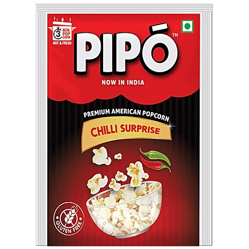 About the Product Surprise your friends and throw a spicy new challenge at them with PIPOs Chilli surprise. It is gluten and cholesterol free that makes it a very light and healthy snack. Anytime snack to get rid of your food cravings. Just cook, serve in 3 minutes. Ingredients Popping Corn, Refined Edible Palmolein Oil, Iodised Salt, Spices And Condiments Storage Store in a cool, dry and hygienic place. Keep away from direct sunlight. Once opened, keep it in an airtight container. How to Use Empty the contents into a deep, thick-bottomed pan or pressure cooker. Cover with a lid. Leave a small gap facing away from you, allow steam to escape. Cook on medium flame, shake utensil until popping slows down to 1-2 secs between pops. Hot'n'Fresh popcorn ready in just 3 minutes!