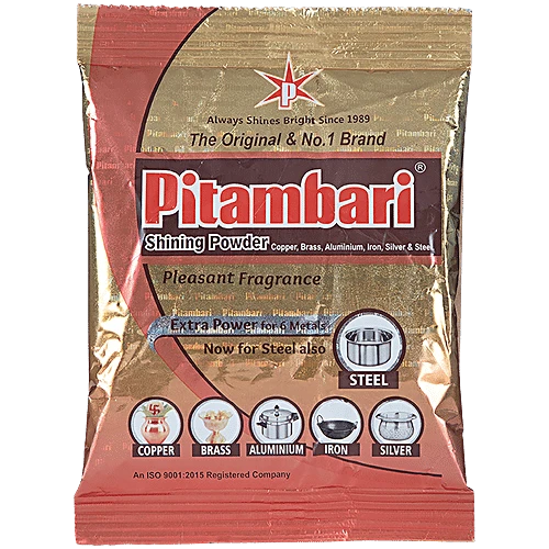 Introducing the Pitambari Shining Powder, a revolutionary cleaning and polishing solution that effortlessly restores the gleam and brilliance to a wide range of surfaces in your home. Formulated with a special cleaning agent, this powder effectively removes oiliness, tarnish, and stubborn stains from copper, brass, aluminium, iron, silver, and steel utensils, leaving them with a dazzling shine and a flawless finish.