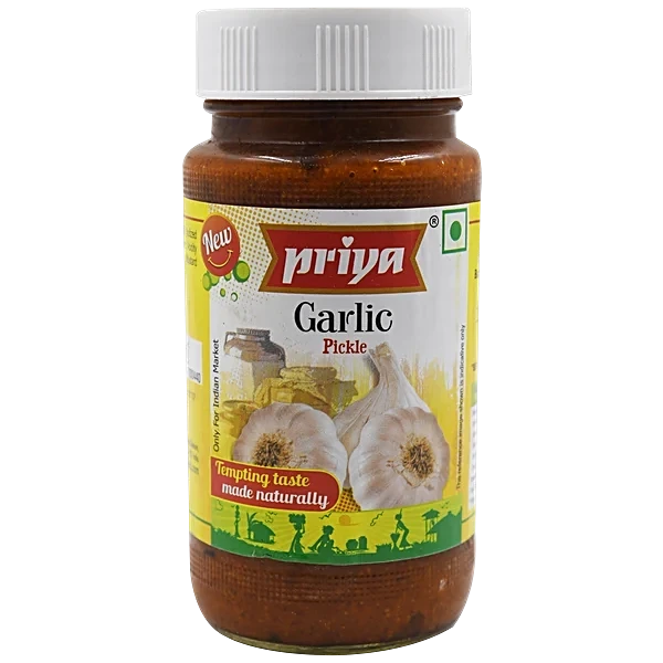 bout the Product Priya's Garlic Pickle is a great combination of mild Indian baby garlic with chilli and authentic spices. It is a very tangy and spicy taste. This Garlic Pickles are made of delicious shredded garlic in oil. Zest up your meal with this mouth-watering pickle. Priya’s Garlic Pickle is yet another novel indulgence made out of an otherwise indispensable ingredient of the Indian kitchen – Garlic. The aroma is finely captured and made into a pickle to give even the best of sauces and ketchup a run for money because Priya’s Garlic Pickle forms the most delightful accompaniment for any of the so-called fast foods. Ingredients Garlic, Edible Vegetable Oil, Iodiesed Salt, Chilli Powder, Musteard Powder, Water Synthetic Vinegar, Citric Acid And Other Spices. Storage Store in a cool, dry and hygienic place. Nutritional Facts Nutritional Values Per 100G : Energy: 184 Kcal