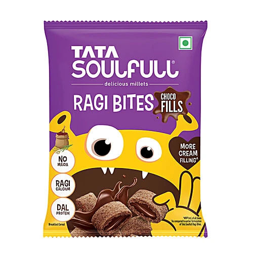 Remember the day when Ragi based foods had to be force fed to kids? Well, now you can forget them! We just made Ragi super fun by combining it with Dal and a Chocolate filling- Something kids just cannot resist! Ingredients Open tab Ragi (34.1%), Chocolate Cream Filling(32%) [Sugar, Interesterified Vegetable Fat, Cocoa Powder(2.8%), Milk Solids, Emulsifier(INS322(1))], Rice, Refined Sugar, Bengal Gram Dal(1.8%), Cocoa Powder, Iodised Salt, Nature- Identical Flavouring Substance, Stabilizer (INS 170(i)), Natural Colour (INS 150d), Edible Vegetable Oil (Palmolein), Antioxidant (INS 320), Emulsifier (INS 322(i)) ALLERGENS: Contains Milk, Soy Nutrition Open tab Serve size: 50 g | Servings per pack: 20 Nutrition Per 100 g per serve % RDA Energy (kcal) 454 11.4 Protein (g) 5.1 Carbohydrates (g) 74.5 Total Sugars (g) 29.3 Added Sugars (g) 23 23 Dietary fiber (g) 6.7 Total Fat (g) 15.1 11.3 Saturated Fat (g) 11.2 25.5 Trans Fat (g) 0 0 Cholesterol (mg) 0 Sodium (mg) 126 3.1 Calcium (mg) 189 9.5
