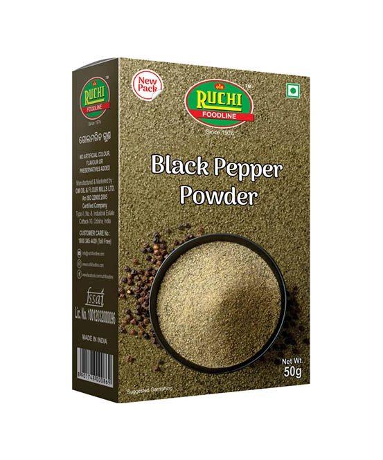 Ruchi Black Pepper Powder is made by selecting premium quality peppercorn which is cleaned thoroughly before grinding. Special low temperature grinding facilitates proper taste and aroma retention. It is used in several dishes to improve taste and enhance flavor. It can also be used in tea during cough & cold. Additional Information Health Benefits. EAN: 8901748000869