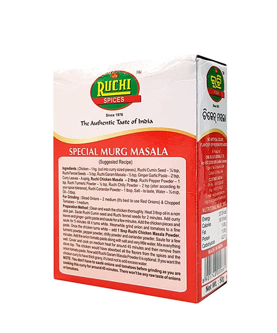 RUCHI Chicken Masala with Roasted Indian Spices is an easy and tasty recipe. It gives your chicken dishes wonderful taste and awesome fragrant. You can prepare variety of tasty dishes with this masala. Ingredients : Coriander, Chilli, Turmeric, Cumin, Black Cumin, Aniseed, Black Pepper, Small Cardamom, Big Cardamom, Nutmeg, Clove, Ginger, Cinnamon, Bay leaf, Fenugreek, Salt, Garlic, Onion and Kasoori Methi.