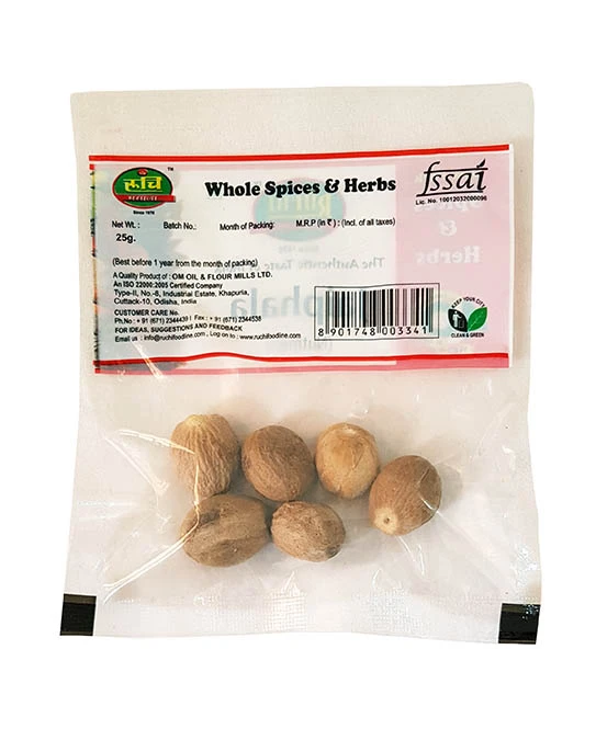 Jaiphal or Nutmeg has a distinctive pungent fragrance and a warm slightly sweet taste, which is used to flavour many kinds of baked goods, confectioneries, puddings, potatoes, meats, sauces, vegetables etc. Additional Information Health Benefits