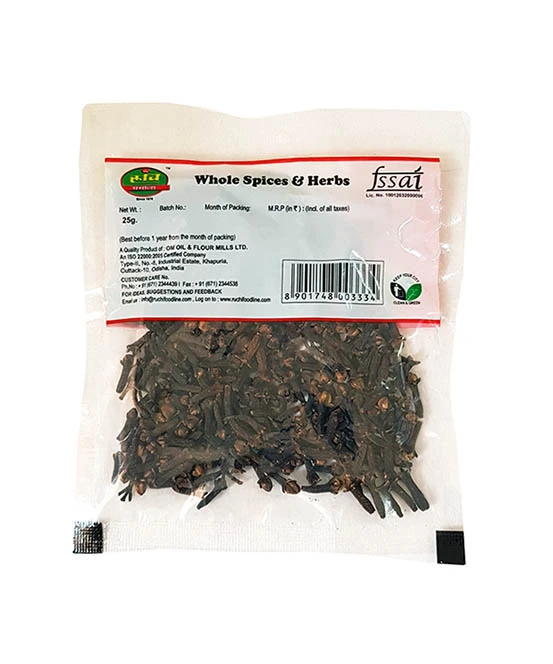 Ruchi Cloves are the aromatic flower buds of a tree in the family Myrtaceae, Syzygium aromaticum. They are native to the Maluku Islands in Indonesia and are commonly used as a spice. Cloves are commercially harvested primarily in Bangladesh, Indonesia, India, Madagascar, Zanzibar, Pakistan, Sri Lanka, and Tanzania. How to Use Cloves are used to give aromatic and flavour qualities to hot beverages, often combined with other ingredients such as lemon and sugar. They are a common element in spice blends. Cloves are used in Indian Ayurvedic medicine, Chines