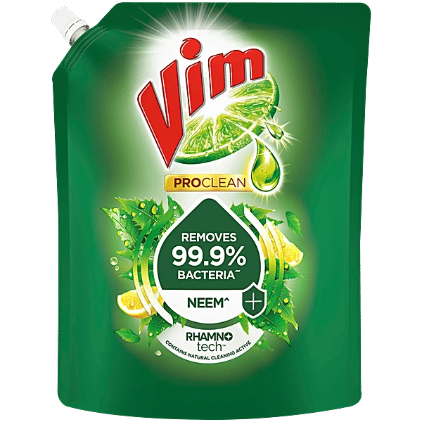 Introducing Vim ProClean Dishwash Liquid Neem, a revolutionary dishwashing solution that not only leaves your dishes sparkling clean, but also removes up to 99%* of harmful bacteria. Specially formulated for the Indian kitchen, this powerful liquid penetrates deep into tough stains, breaking them down effortlessly without the need for excessive scrubbing.