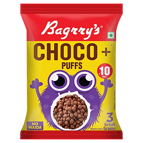 Bagrry's Choco+ Puffs is a nourishing & solid breakfast for kids. It is made with Oats + Whole Wheat + Rice. It makes milk chocolaty & delicious. The chocolaty choco flavour is loved by kids. With Bagrry's Choco+ Puffs, no kids say no to Milk! Bring the Chocolaty Choco flavour and crunchy Goodness of Milk to your Kid's cereal for breakfast. Ingredient Multigrain Flour 56.1% [Whole Wheat Flour (33.9%), Rice Flour (14.8%), Oat Flour (7.4%)], Sugar, Cocoa Solids (4.6%), Palmolein Oil, Cereal Extract, Glucose, Mineral, Colour (INS 150d), Emulsifier (INS 322), lodized Salt, Natural & Nature - Identical Flavouring Substances.