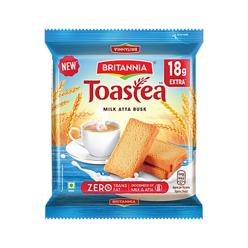 About the Product Britannia Toastea Doodh Rusk is a traditional tea companion and is loved by many. It is as crispy as your traditional rusk, but with comes, Butter and the right amount of sweetness: its taste will leave you amazed. Britannia Toastea Premium Bake Rusk for long has been a part of every home for, new Britannia Toastea Butter Rusk will also be sharing those moments of joy. Ingredients Refined Wheat Flour (Maida), Invert Syrup, Margarine, Sugar, Refined Palm Oil, Orange Puree (5.4%), Humectants [420(i), 420(ii)], bakery Improver Mix {Emulsifiers [481(i) &471], Anticaking Agent [170(i)], Flour Treatment Agents [1101(i) & 1101(i)] And Antioxidant (300)}, Yeast, Vital Gluten, Milk Solids, Stabilizer (440), Iodised Salt, Emulsifier(471), Apple Puree, Acidity Regulator(330,296), Preservatives (282, 202), Butter, Nature Identical Flavouring Substances And Colours (110, 100) Nutritional Facts Per 100g: Energy 439 kcal Protein 9.3g Carbohydrate 80.2g of which Total Sugars 21.7g Added sugar 21.2g Total Fat 9g Saturated Fatty Acids 4.4g Mono Unsaturated Fatty Acids 3.2g Poly Unsaturated Fatty Acids 1.1g Trans Fatty Acids 0g Cholesterol -3.1mg Sodium -230mg How to Use Ready to eat.