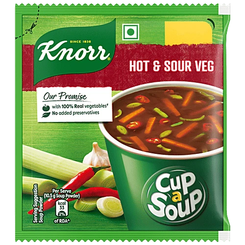 Knorr Hot & Sour Instant Cup-a-Soup is a spicy, tangy, Chinese-style soup designed for quick cravings. Just add hot water and enjoy a comforting hot sip within minutes. Ideal for office breaks, hostel students, travel, rainy evenings, winter nights, and light warm snacking. Groocy delivers this cup-a-soup sachet fresh, fast, and hygienically to your doorstep.