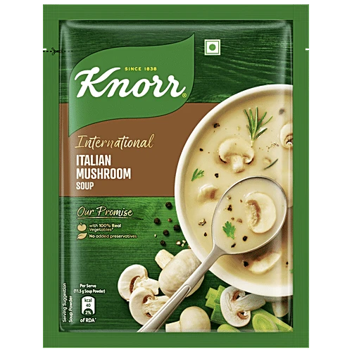 Knorr International Italian Mushroom Instant Soup is a rich, creamy, continental-style mushroom soup inspired by Italian flavours. Made with real mushroom bits, herbs, and a smooth velvety texture. Perfect for office breaks, quick meals, cold evenings, travel, hostel cravings, and warm comfort sipping. Groocy delivers this premium soup sachet fresh, fast, and hygienically to your doorstep.
