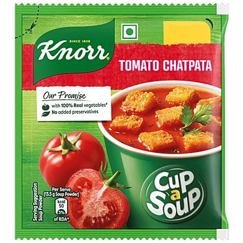 Knorr Tomato Chatpata Instant Cup-a-Soup is a tangy, spicy, chatpata tomato soup packed with bold flavours. Ready in minutes—just add hot water and sip. Perfect for office breaks, hostel students, travel, evening cravings, winter warmth, and quick light snacking. Groocy delivers this cup-a-soup sachet fresh and fast to your doorstep.