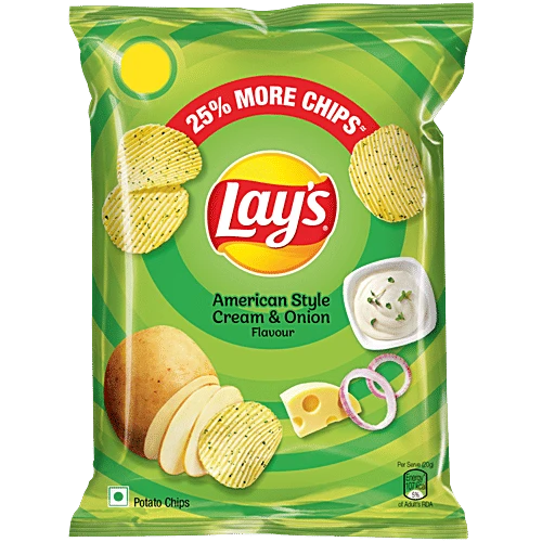 About the Product Add some hearty flavour to your day with Lay’s American Style Cream and Onion! These chips are seasoned to perfection with a rich blend of cream, onions, and fresh herbs. Savour this exciting mix and experience flavours that will surely make you come back for more! Made from only the highest quality farm-grown potatoes, Lay’s Chips has always kept the highest standard of excellence, and with mouth-watering cream and onion flavours, the experience can only be accentuated. Lay’s American Style Cream and Onion can be enjoyed anywhere and anytime for a well-needed kick of flavour. From the quick snack breaks at work to the impromptu get-togethers, this snack is perfect to binge on. Key benefits: • American Style Cream & Onion flavour • Cooked to crispy perfection • Versatile snack enjoyed in any setting • 100% vegetarian Ingredients Potato, Edible Vegetable Oil (Palmolein, Rice Bran Oil), *Seasoning (Sugar, Iodized Salt, Milk Solids, ~Spiced And Condiments, Maltodextrin, Flavour (Natural And Nature Identical Flavouring Substances), Cheese Powder, Hydrolysed Vegetable Protein, Flavour Enhancers (627, 631), Edible Vegetable Oil (Palm, Coconut), Anticaking Agent (551). *As Flavouring Agent. ~Contains Onion. Features • DELECTABLE FLAVOUR: The American-style cream and onion chips are topped with an exquisite blend of delicious flavours • QUALITY POTATOES: Made from the highest quality, farm-grown potatoes • 100% VEGETARIAN: Lay’s American Style Cream & Onion is a 100% vegetarian snack • PERFECT FOR ANY OCCASSION: A versatile snack that can be enjoyed in any setting • SHELF LIFE: For the best flavour, crunch, and overall experience, Lay's American Style Cream & Onion is best consumed within 5 months • ABOUT THE BRAND: With its rich history and know-how, Lay’s is always on the lookout for the best flavours, cuts, and innovations that are guaranteed to bring a smile to your face How to Use Enjoy Lay’s American Style Cream & Onion chips on their own or pair them with your favourite dip. You can also have them as an accompaniment to your sandwich or use them to create fun recipes.