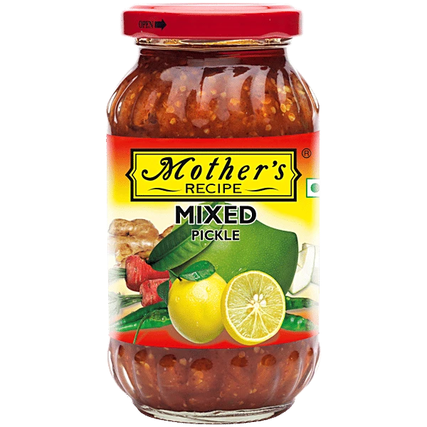 Mother's Recipe Mixed pickle 250GM Mother's Recipe Pickle - Mixed About the Product Mothers Recipe Mixed Vegetable Pickle is a necessary item in practically every Indian meal. Traditional pickle recipes using distinctive spice mixes and vegetable oils are made with a wide variety of vegetables. A variety of carefully selected fruits and vegetables from across India are mixed in this exotic Indian Pickle. Melting into a distinct flavour that people across India have come to love for generations. Ingredients Mixed Vegetable Pieces (Mango, Carrot, Lime, Green Chili, Amba Haldar, Karonda, Kerda &/Or Other Seasonal Vegetables), Brine (Edible Common Salt, Acidity Regulator (Ins-260)), Edible Vegetable Oil, Spices & Condiments, & Asafetida. Nutritional Facts Nutritional Values Per 100G : Energy: 156 Kcal Carbohydrate: 14 G Sugar: 5 G Total Fat: 10 G Saturated Fatty Acids: 2 G Monounsaturated Fatty Acids : 0 G Polyunsaturated Fatty Acids :0 G Trans Fatty Acids : 0 G Protein : 2 g Storage Store in a cool, dry and hygienic place.