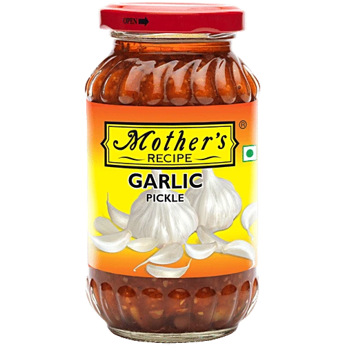 Mothers Recipe Pickle - Garlic is prepared with Garlic cloves garnished with fenugreek, seasoned with chili powder & given the spicy part simply tempting. Experience the flavor of this Garlic Pickle once and you'll be under its spell forever. Ingredients Garlic, Edible common salt, Edible vegetable oil, Spices & Condiments, Water, Acidity regulator(INS-330),(INS-260) & Asafoetida. Other Product Info EAN Code: 8906001051312 Country Of Origin: India