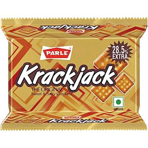 About the Product Parle Krack Jack is a crunchy and tasty biscuit with a balance of sweetness and saltiness. Its sweet and salty flavour is a perfect pair for tea or coffee. It has a crispy and crunchy texture with the right amount of sweet and salty flavour. Parle Krack Jack Biscuit is a crunchy and tasty biscuit with an ideal balance of sweetness and saltiness. Once you begin relishing it, you won't be able to end. You will desire more. Although Krackjack sweet and salty biscuits can be enjoyed anytime, it leaves wonderfully well with your evening cup of tea. Ingredients Material: Wheat Flour, Edible Vegetable Oils, Sugar, Raising Agents, Invert Sugar Syrup, Iodised Salt, Yeast, Acidity Regulators, Emulsifier, Dough Conditioner And Improver. Capacity: 800 Gram Features: Combination Of Taste And Health; Sweet And Salty Cracker; Perfect With Your Cup Of Tea. Type: Biscuit 5. Brand: Parle Shelf Life: 6 Months Container Type: Pouch. How to Use It goes well with beverages like tea or coffee. Conveniently packed easy to carry for quick bite Care Instruction Keep in a cool and dry place and away from direct sunlight. Once opened store in an airtight container.