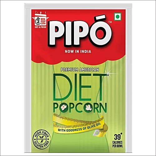 About the Product The health-conscious need not worry about snacking anymore, as with PIPOs Instant Diet popcorn- you can have unlimited fun. It is gluten and cholesterol free which makes it a very light and healthy snack. It is an anytime snack to get rid of your food cravings. Just Cook, serve in 3 minutes. Ingredients Popping Corn, Refined Edible Palmolein Oil, Refined Edible Olive Pomace Oil And Iodised Salt Storage Store in a cool, dry and hygienic place. Keep away from direct sunlight. Once opened, keep in airtight container. How to Use Empty the contents into a deep, thich-bottomed pan or pressure cooker. Cover with a lid. Leave small gap facing away from you, allow steam to escape. Cook on medium flame, shake utensil until popping slows down to 1-2 secs between pops. Hot'n'Fresh popcorn ready in just 3 minutes!