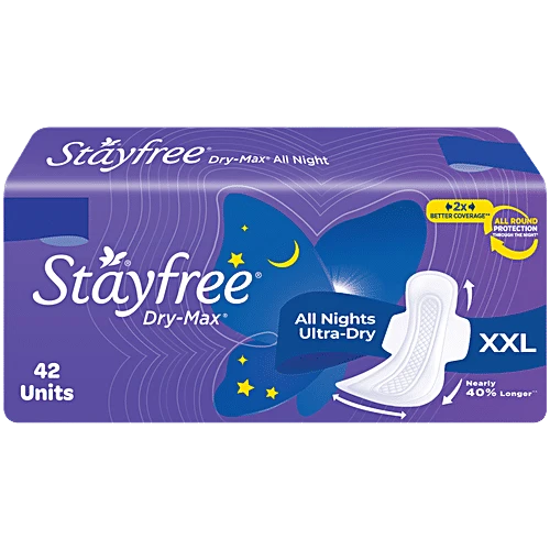 Stayfree All Night Ultra-Dry Max XXL is specially designed for superior overnight protection with extra-long and extra-wide coverage.