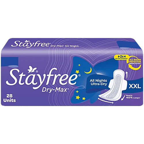 Stayfree Dry-Max All Nights Ultra-Dry XXL Pads are designed to give maximum overnight protection with extra-long and extra-wide coverage for heavy flow nights.