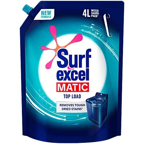 Surf Excel Matic Top Load Liquid Detergent is specially designed for top-load washing machines. Its advanced liquid formula dissolves quickly, removes tough stains, protects fabric colour, and prevents detergent residue. This 4 L pouch pack is economical, convenient, and ideal for families with heavy laundry loads. Leaves clothes bright, fresh, and clean in every wash.